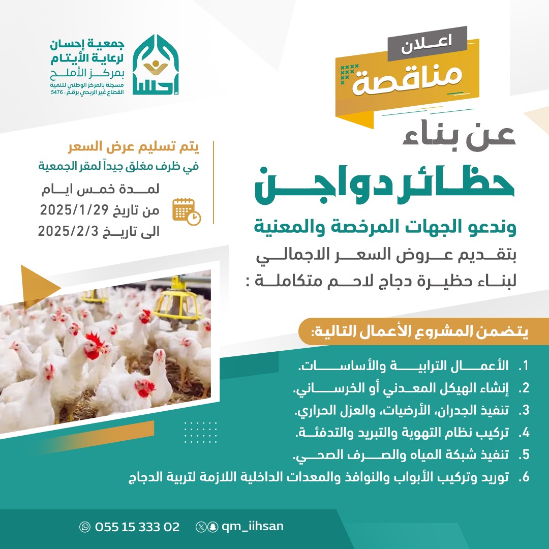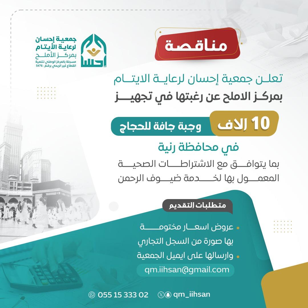 مناقصة: تعلن جمعية إحسان لرعاية الايتام مناقصة - للجهات المرخصة والمعنية - لمدة خمسة ايام من تاريخ الاعلان " ابتداء من 10 / 3 / 1447 وحتى تاريخ 15 / 3 / 1447 هـ